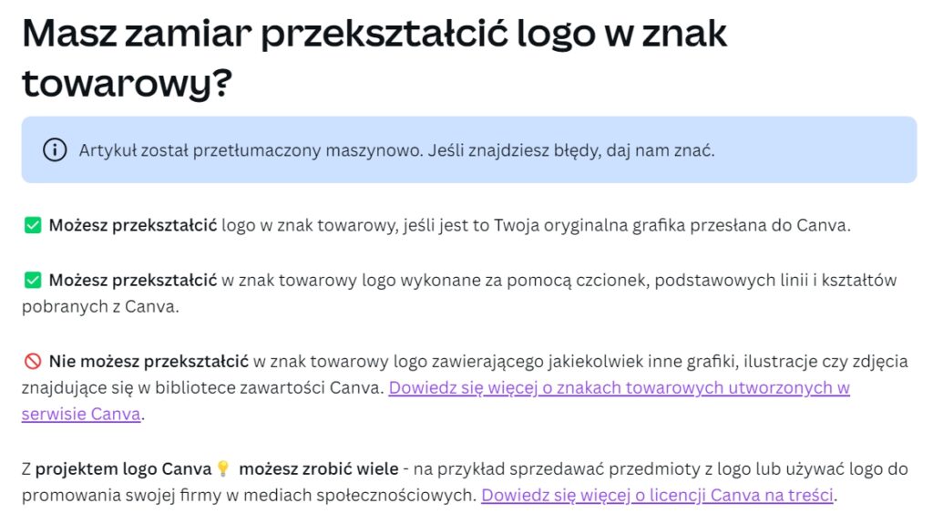 Należy pamiętać, że elementy graficzne, których używamy, są objęte licencjami – dotyczy to nie tylko Canvy, ale w zasadzie każdego miejsca, z którego możemy pobrać lub wygenerować grafiki, zdjęcia, filmy czy dźwięki. Nawet jeśli licencja zezwala na użytek komercyjny – to znaczy w projektach, które przynoszą nam zysk – bardzo często nie zezwala na użycie elementów w znakach towarowych. Canva, tak samo jak wiele tego typu narzędzi, mówi wprost, że jeśli stworzyliśmy swoje logo z jej gotowych elementów – nie mamy prawa go zastrzec, nie jest więc i nigdy nie ma prawa być naszym pełnoprawnym znakiem marki.